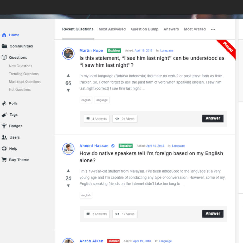 Discy comes with a unique users page, detailed with everything related to users like best answers, badges, questions, follow buttons, points and more!